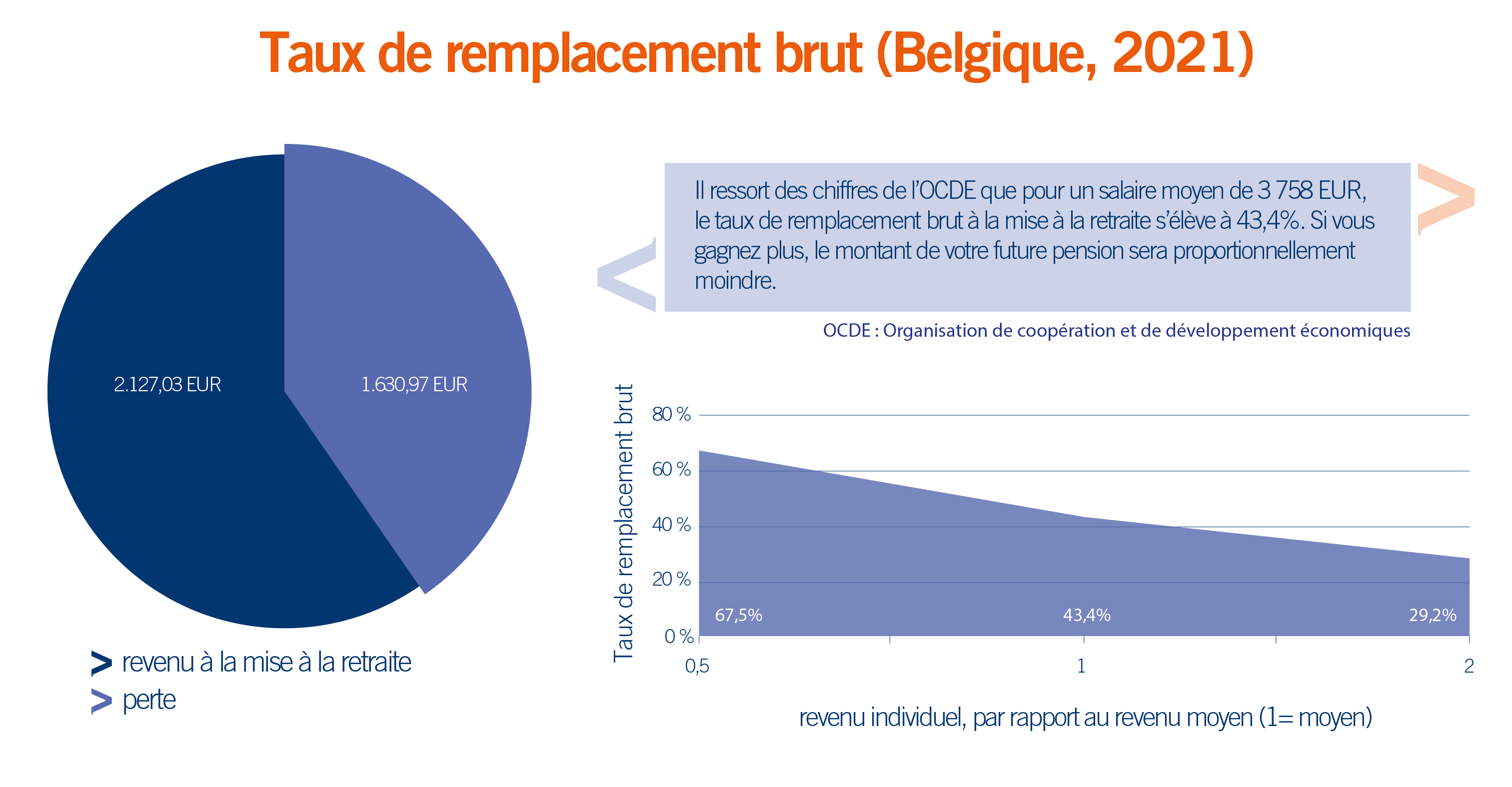 CÔÇÖest ce qui ressort des chiffres que vous pouvez retrouver ci-dessous, publi├®s par lÔÇÖOCDE, lÔÇÖOrganisation de coop├®ration et de d├®veloppement ├®conomiques. Selon leur rapport, un Belge qui percevait un salaire brut moyen de 3 758 EUR en 2021 pouvait sÔÇÖattendre ├á recevoir une pension brute ├®quivalant ├á 43,4 % de son dernier salaire brut. Ces chiffres sont calcul├®s sur la base de lÔÇÖensemble de la population belge : cela inclut donc les personnes pensionn├®es ayant une carri├¿re plus courte ainsi que les travailleurs ayant connu une ou plusieurs p├®riodes au cours desquelles ils ont moins travaill├®, voire pas du tout.