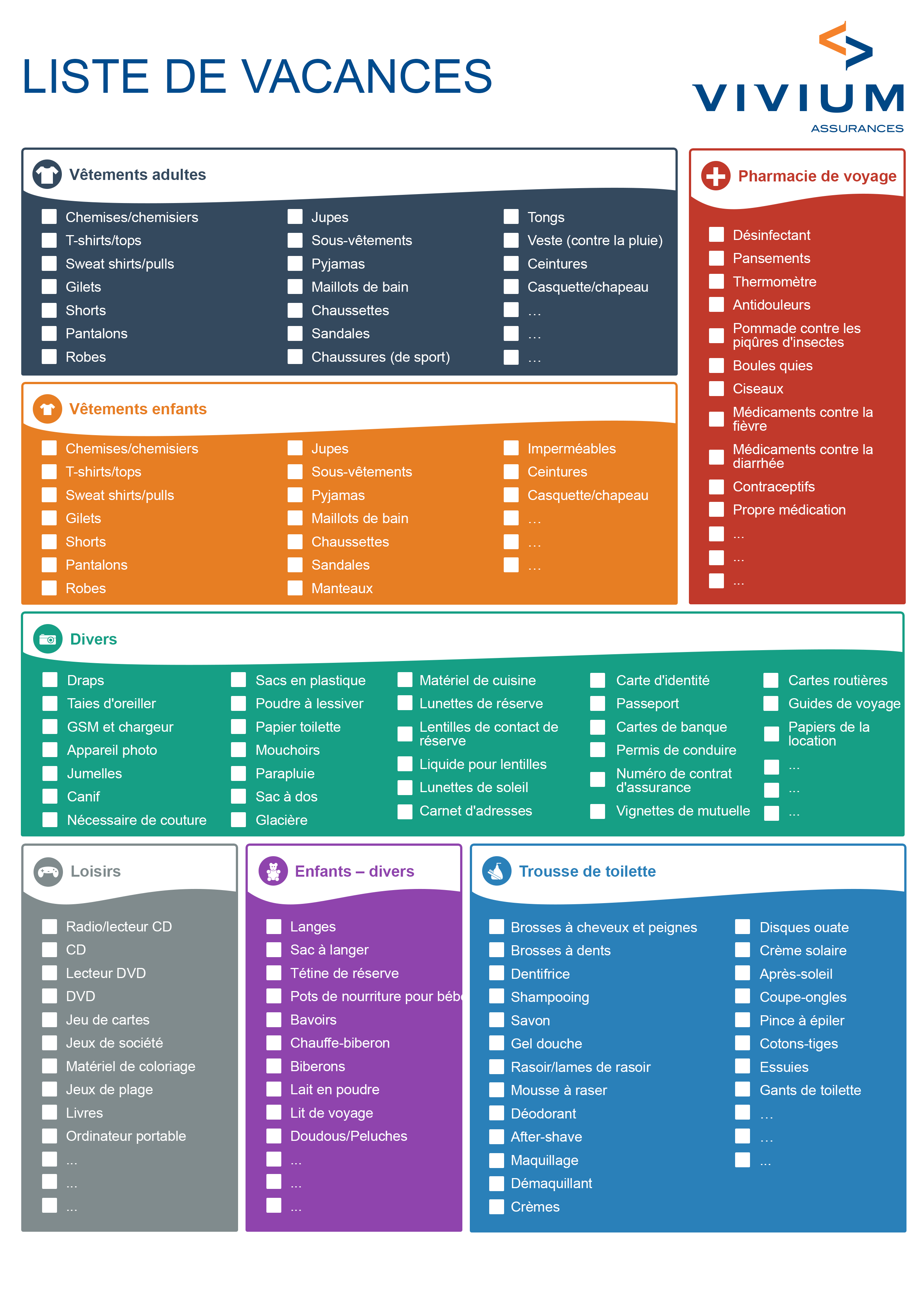 Il est toujours d├®sagr├®able de constater sur place que vous avez oubli├® quelque chose d'indispensable : le chargeur de votre appareil photo ou GSM, le doudou de votre bambin, ... Voici une liste pratique que vous pouvez imprimer. Vous pouvez y ajouter des choses si n├®cessaire.